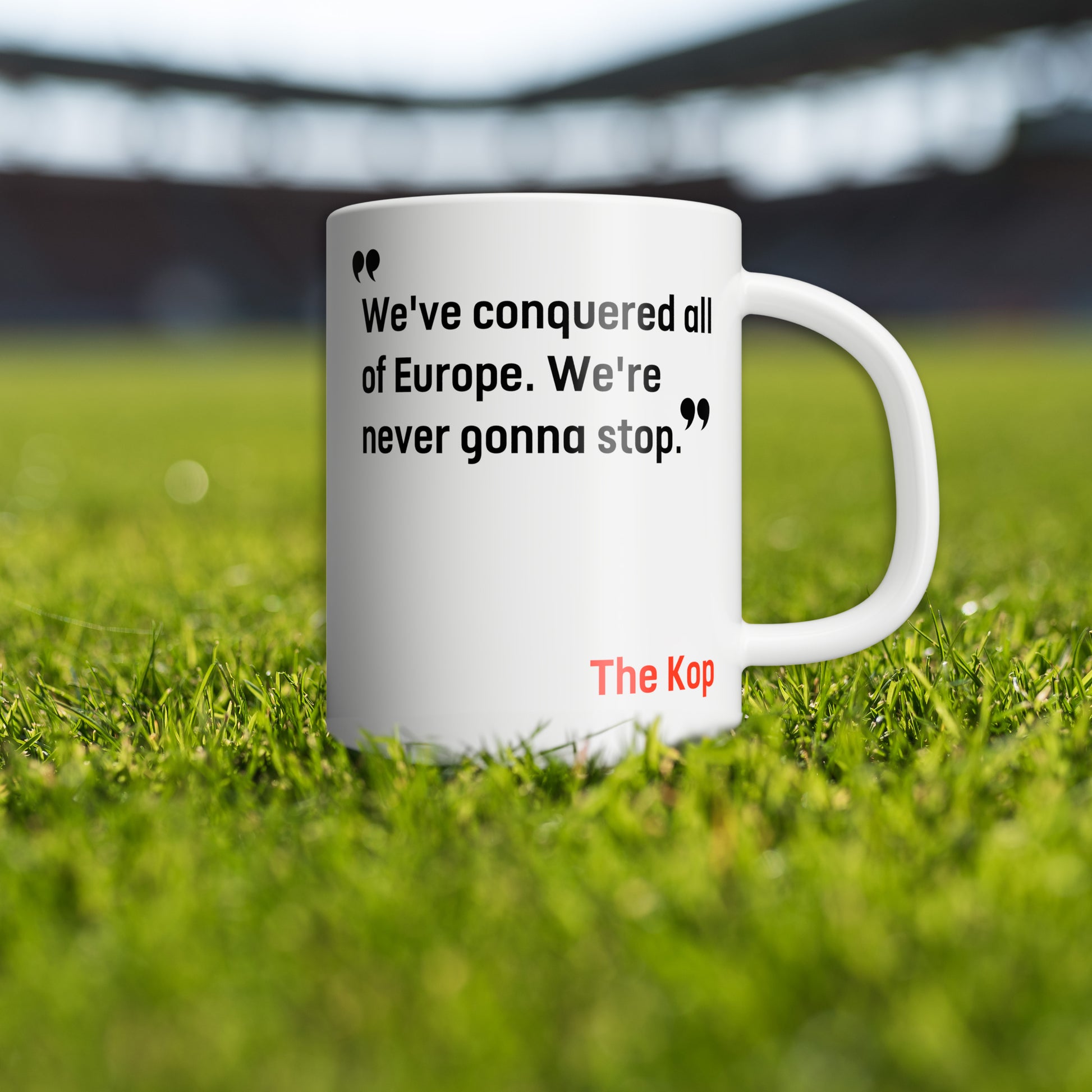 our latest addition to the Liverpool Football Club mug collection: the exclusive "We've Conquered All of Europe" edition, featuring the iconic chant that resonates through the Kop. Crafted with passion and precision, this mug is a tribute to the unwavering spirit of LFC fans worldwide.